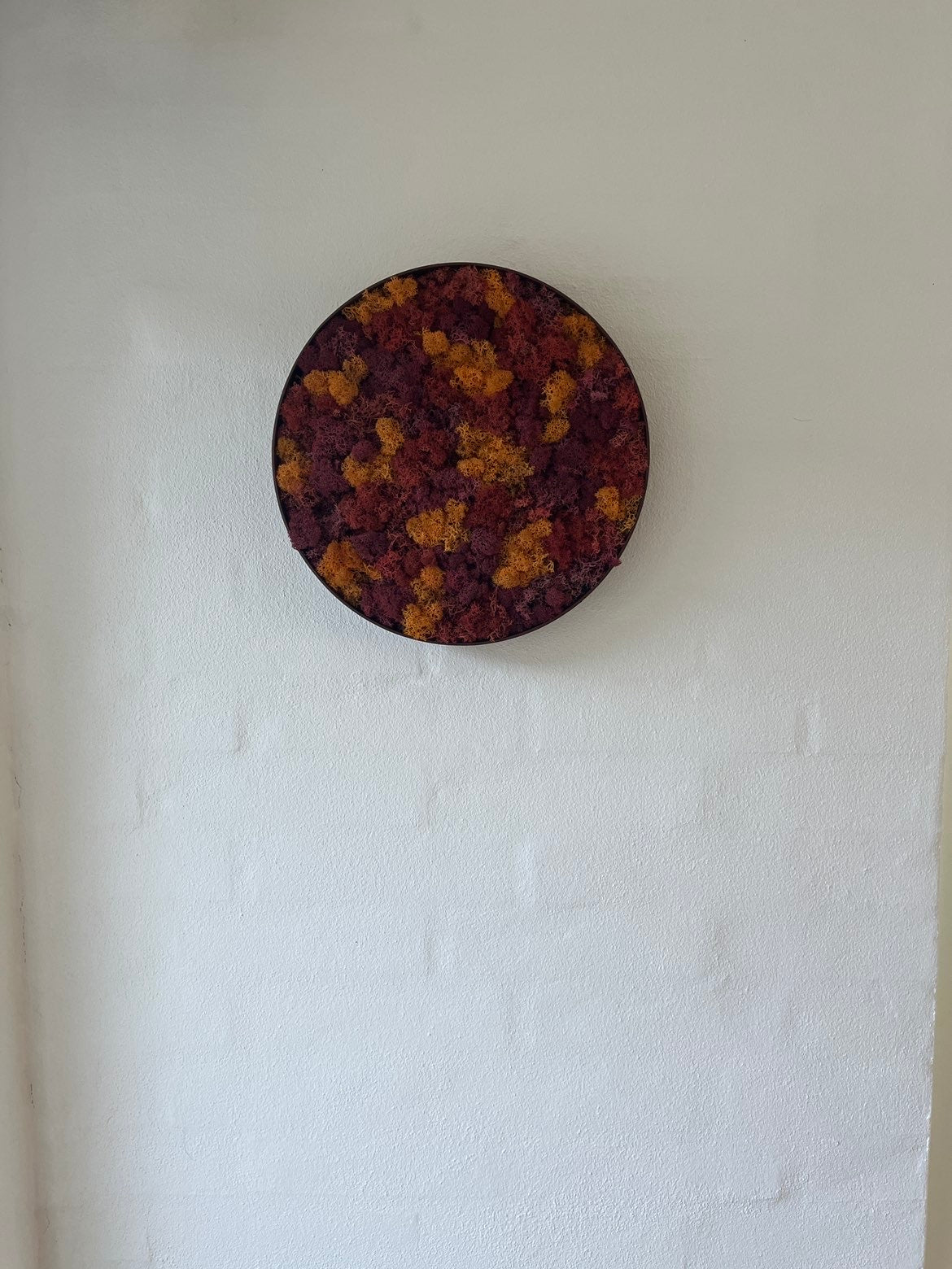 Den samme håndlavede kvalitet og vedligeholdelsesfrie mos – nu i smukke toner af gyldent rav, dyb orange.Et unikt kunstværk, hvor natur og design mødes i perfekt harmoni – skabt i Danmark med kærlighed til detaljen.